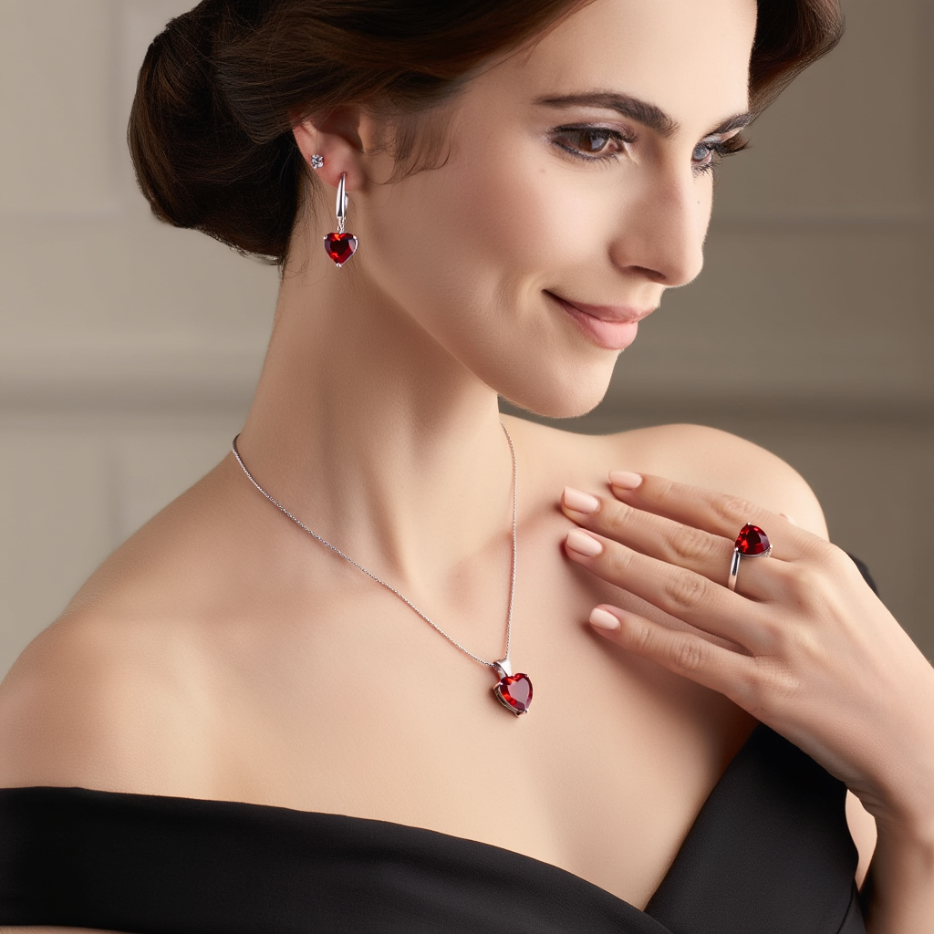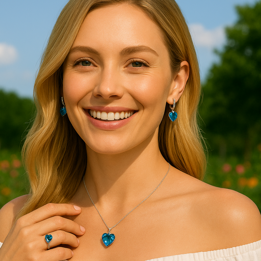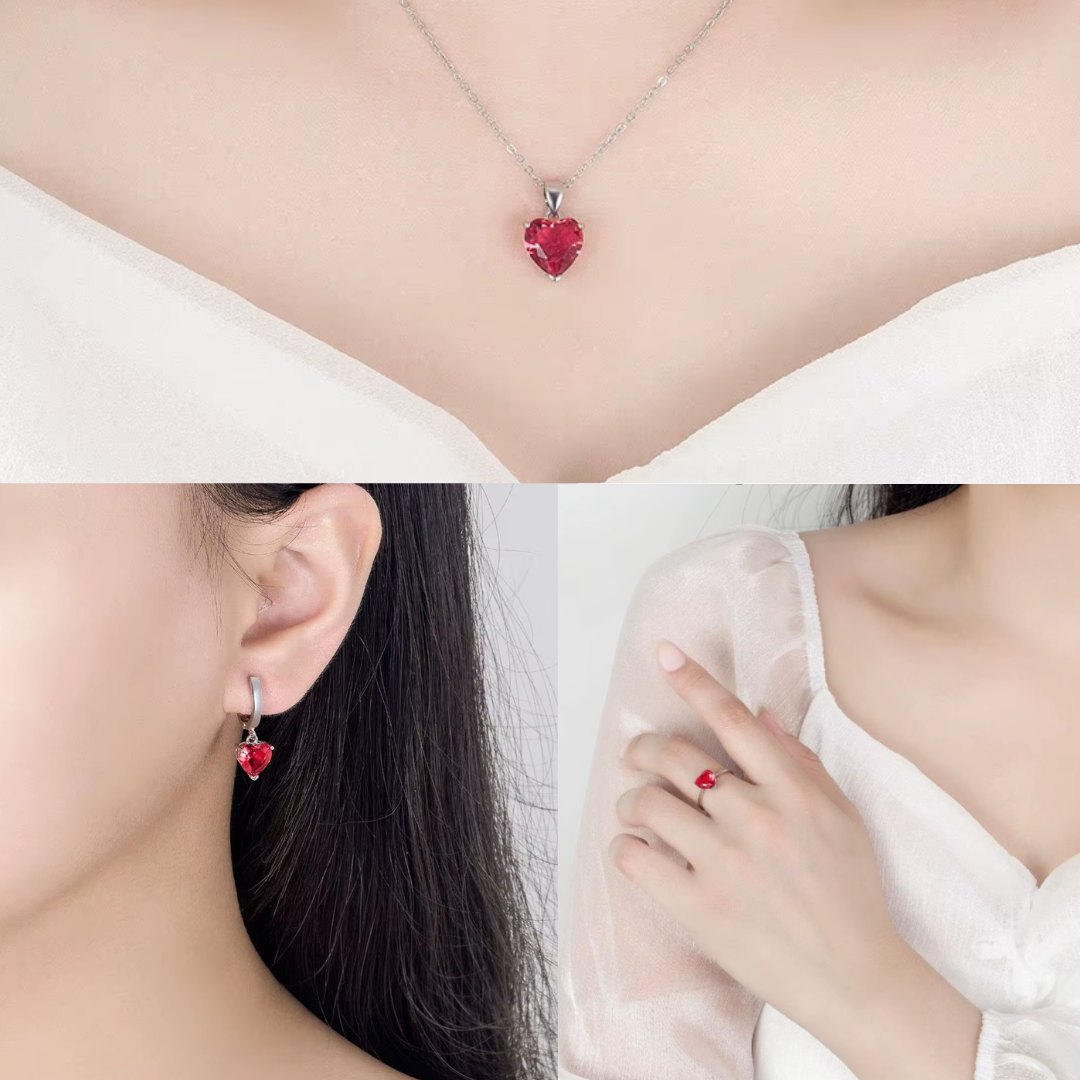 Each piece in this elegant trio — necklace, earrings, and ring — features a stunning heart-shaped zircon stone that glows with brilliance, symbolizing pure love and grace.